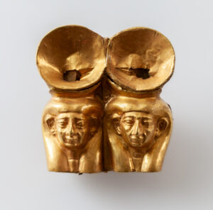 The twin heads of gold at Megdo possibly represent the Egyptian goddess Hathor with spoons. Courtesy of ISAC Museum.